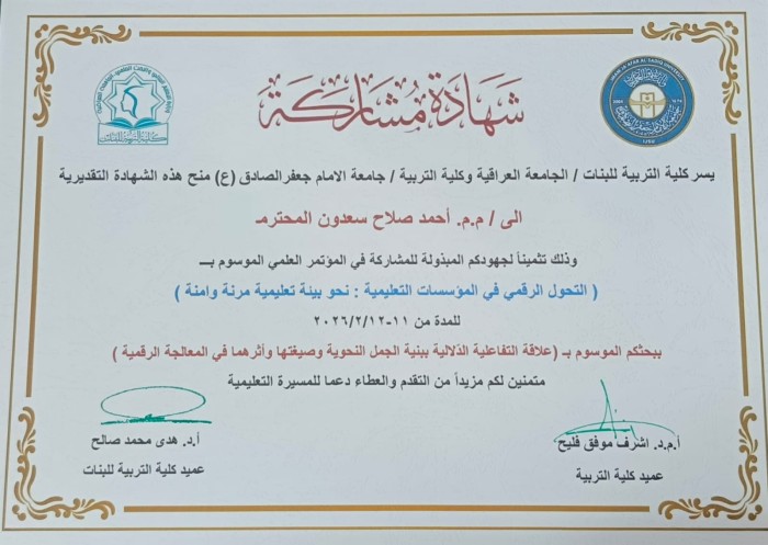 Assistant Lecturer Ahmed Salah Saadoun, a faculty member in the Department of Arabic Language at our college, participated in the scientific conference entitled: