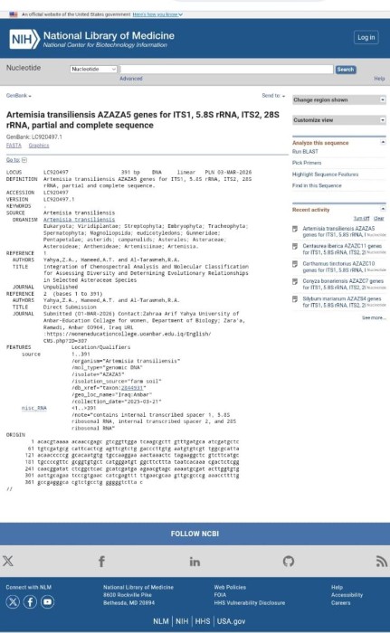 في إنجازٍ علمي جديد يعكس رصانة البحث الأكاديمي وتميّز النشاط العلمي في قسم علوم الحياة – كلية التربية للبنات – جامعة الأنبار، تمكّنت طالبة الماجستير زهراء عارف يحيى من تحقيق سبقٍ بحثي متميّز تمثّل في تسجيل (7) نباتات برية جديدة من بيئة محافظة الأنبار في قاعدة بيانات المركز الوطني لمعلومات التقانة الحيوية التابعة للولايات المتحدة الأمريكية.