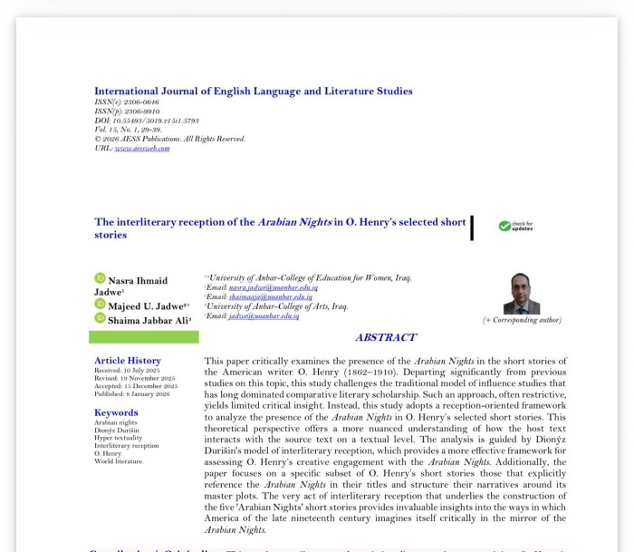 حيث تناول دراسة التلقي التناصي لألف ليلة وليلة في نماذج مختارة من قصص الكاتب الأمريكي، و. هنري مسلطًا الضوء على التداخلات الأدبية وأبعادها النقدية وفق منهجية علمية رصينة.